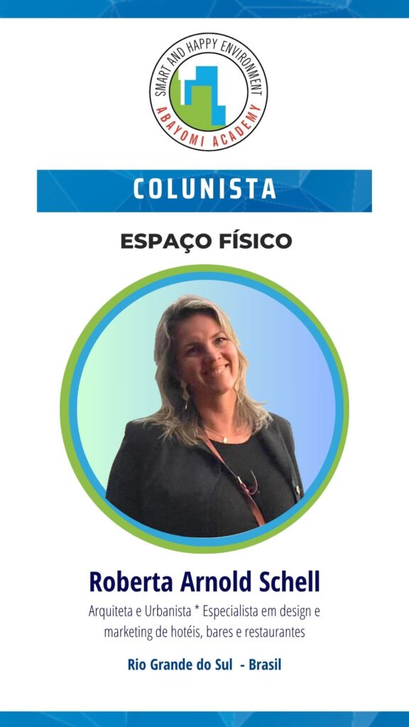 Roberta Arnold Schell é arquiteta e urbanista, corretora de imóveis e especialista em design e marketing de hotéis, bares e restaurantes pela Milano Business School, com pós-graduação no mercado de luxo pela Univali. Também atua em paisagismo, design de interiores, fotografia, contabilidade e estudos de viabilidade imobiliária. Casada e mãe de dois filhos, é colunista dos blogs Soup News e Abayomi Academy, onde compartilha sua expertise em arquitetura, design e mercado imobiliário.